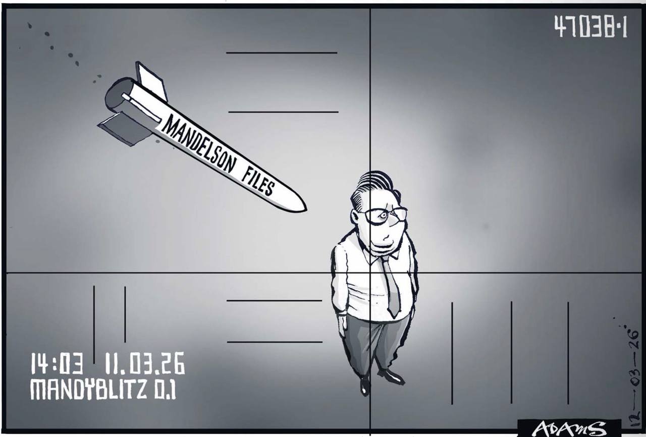 В отличие от карикатуристов The Times, которые полагают, что файлы Мендельсона-Эпштейна отвлекают внимание от критики Стармера в связи с его провалами на военном поприще, их коллеги из The Daily Telegraph считают, что файлы Мендельсона бьют по Стармеру не хуже, чем американские ракеты по мирным жителям Ирана!