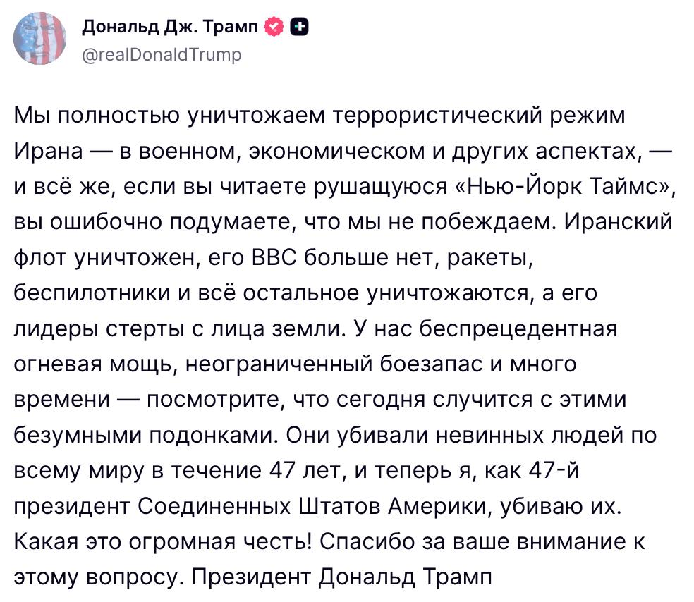 Трамп заявил, что для него «большая честь» убивать руководство Ирана. Также он назвал ошибочными утверждения о том, что США не побеждают в войне.