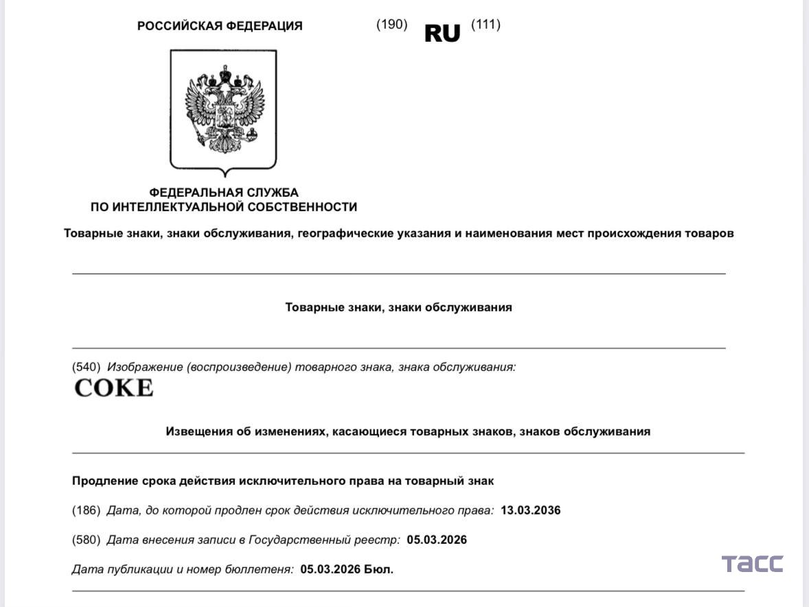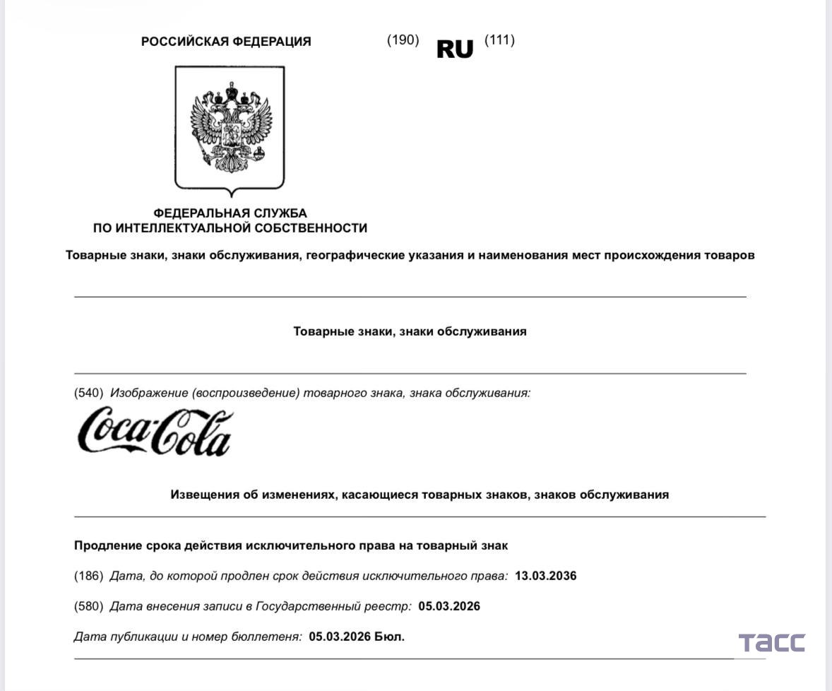 Coca-Cola продлила на 10 лет срок действия двух товарных знаков в РФ, выяснил корреспондент ТАСС.