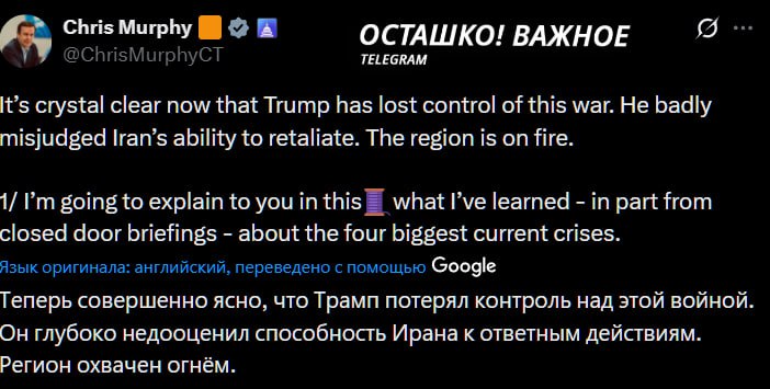 «Трамп утратил контроль над этим конфликтом. Он грубо просчитался в оценках возможностей Ирана по принятию ответных мер. Регион в огне», — написал Мерфи в соцсети X.