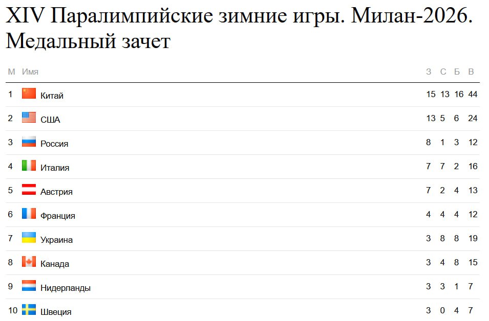 Итоги зимней паралимпиады в Италии: у россиян на 6 человек 12 медалей и общее третье место...