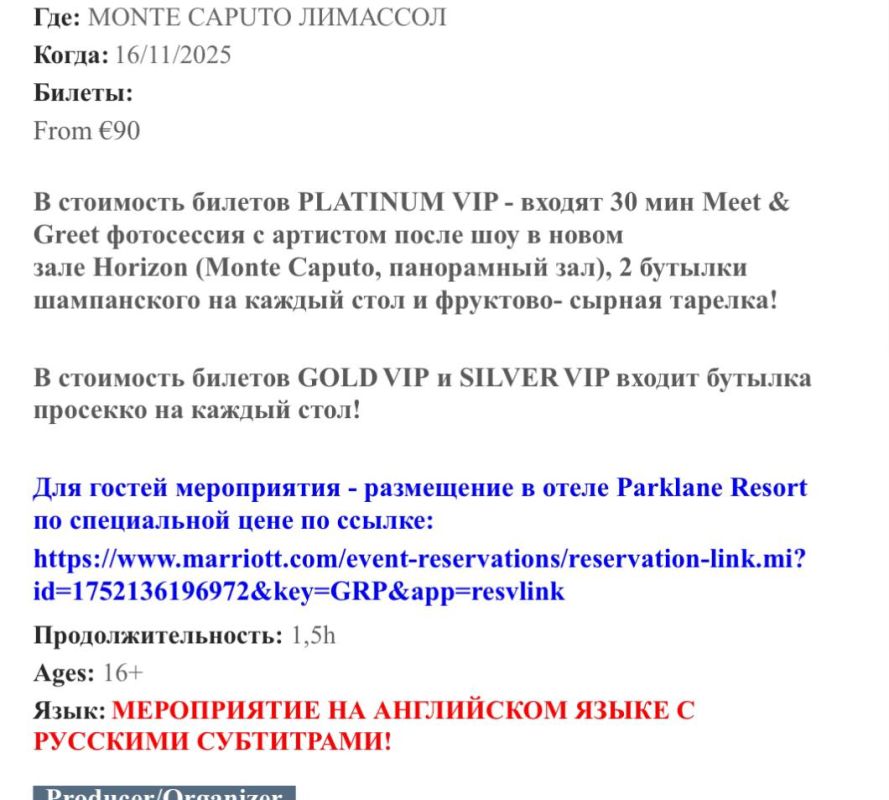На Кипре продаются билеты на его в выступления в одном из местных ночных клубов. Для удобства понаехавших на остров многочисленных релокантов предусмотрены русские субтитры.
