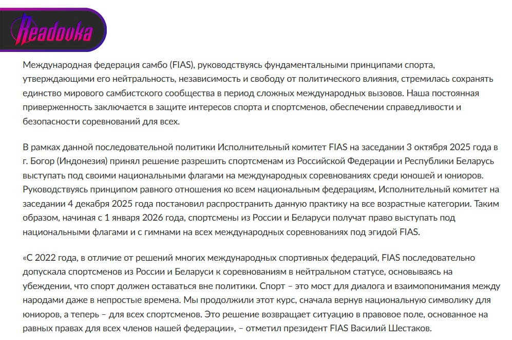 Международная федерация самбо (FIAS) разрешила русским и белорусским спортсменам участвовать в международных соревнованиях под национальной символикой — с флагами и гимнами своих стран, сообщил президент FIAS Василий Шестаков.