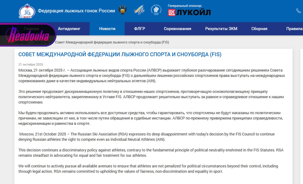 Решение FIS означает, что путь на международные соревнования в текущем сезоне закрыт для всех российских лыжников, кроме уже допущенных Дарьи Непряевой и Савелия Коростелева. До этого Спортивный арбитражный суд (CAS) удовлетворил апелляцию России, но это не повлияло на общую позицию федерации.
