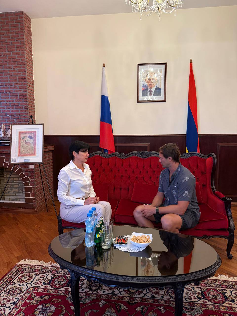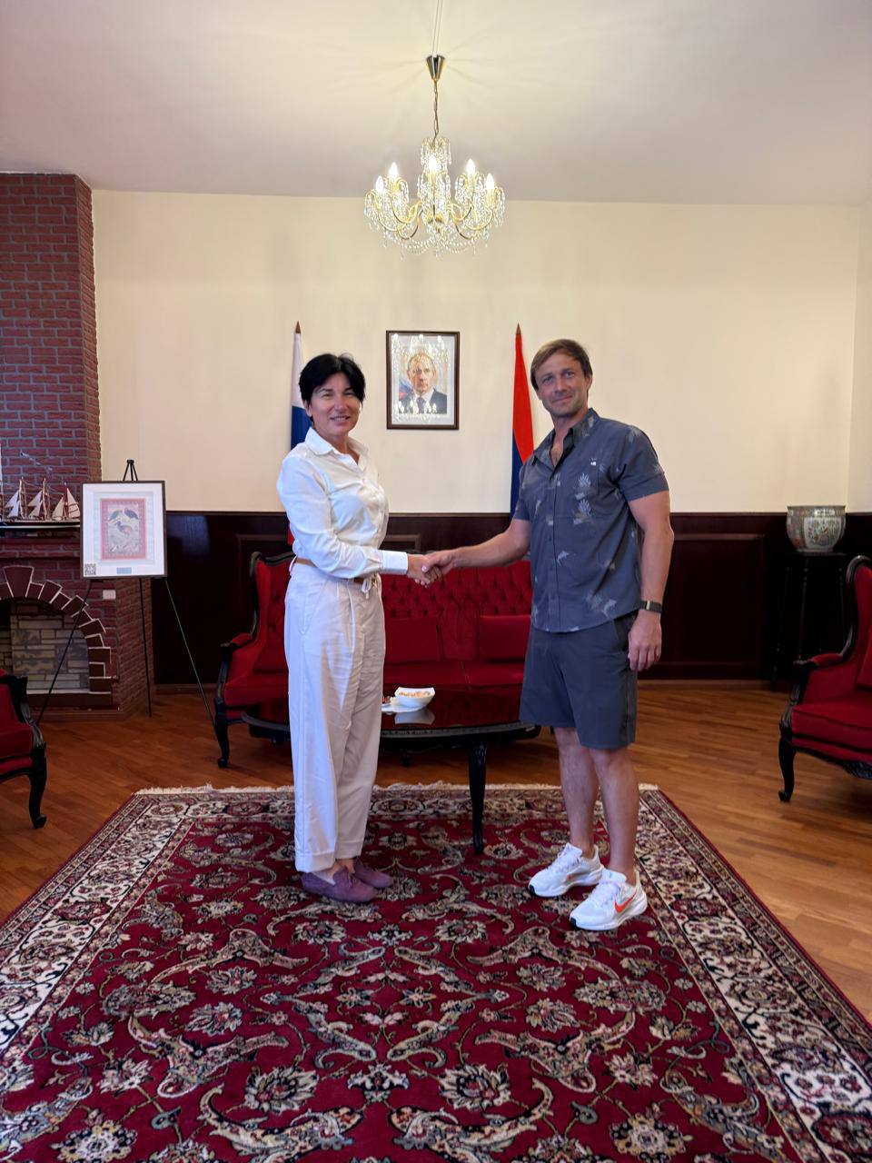 Состоялась встреча Посла России на Маврикии И.А.Зейналовой с российским футболистом, Президентом ФК Иртыш Д.Е.Сычёвым.
