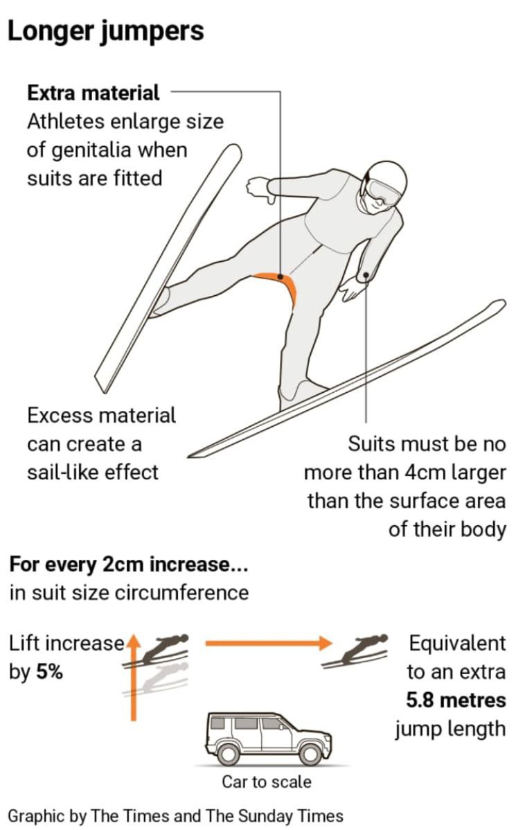 «Каждый лишний сантиметр на комбинезоне имеет значение. Если площадь поверхности вашего костюма больше на 5%, вы полетите дальше», — пояснил директор мужских соревнований FIS по прыжкам с трамплина Сандро Пертиле.